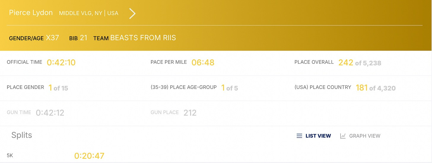 My goal was 42 minutes. This race was really a way for me to set a baseline for my training block. I always race during my training because it’s the easiest way to see small improvements over time. I also think that folks forget they need to train that race day mental fortitude before their big one. You need to know how your body and your mind are going to react in times of great stress.